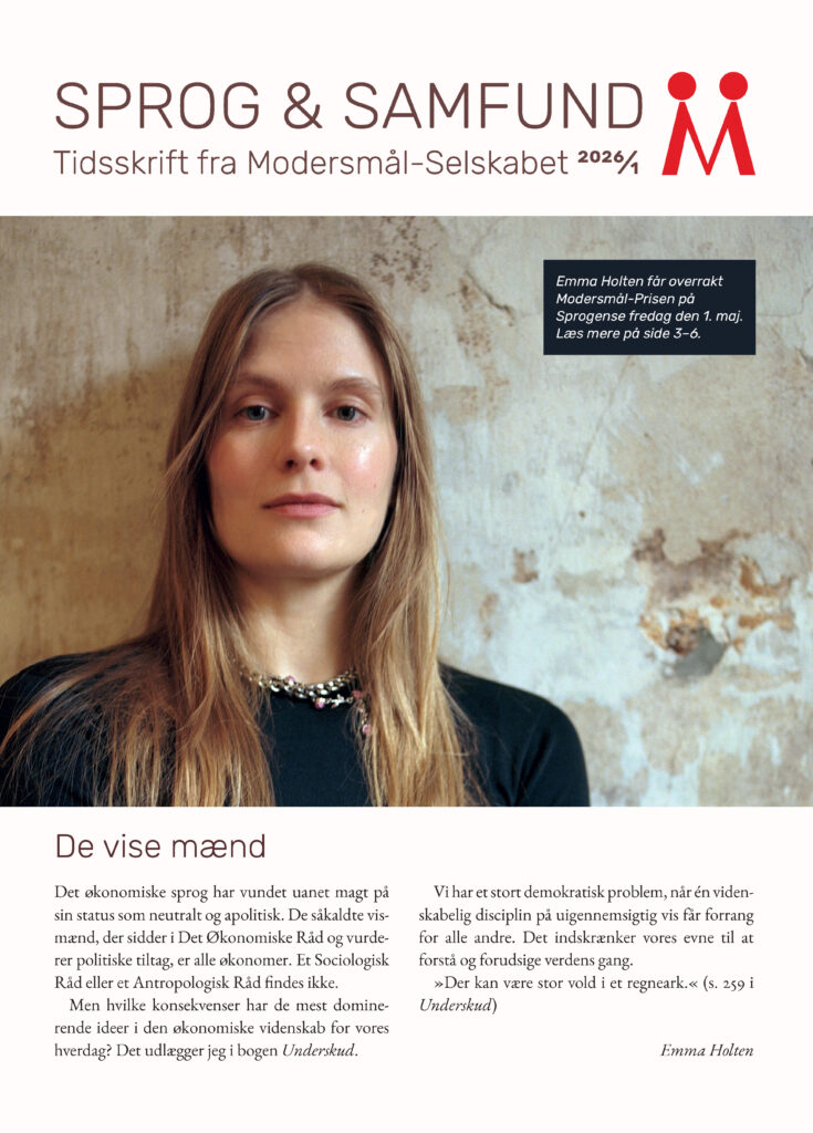 Emma Holten (f. 1991) modtager Modersmål-Prisen 2026 for i bestselleren Underskud – om værdien af omsorg (2024) at afdække, hvordan »økonomiens sprog« er definerende for hele vores måde at indrette vestlige samfund på, fordi det udlægges som en ubestridelig grundpræmis. Holten er litterat, cand.mag. i moderne kultur og kulturformidling, medlem af Human Rights Watch’s rådgivningskomité for kvinders rettigheder, redaktør, debattør og foredragsholder.